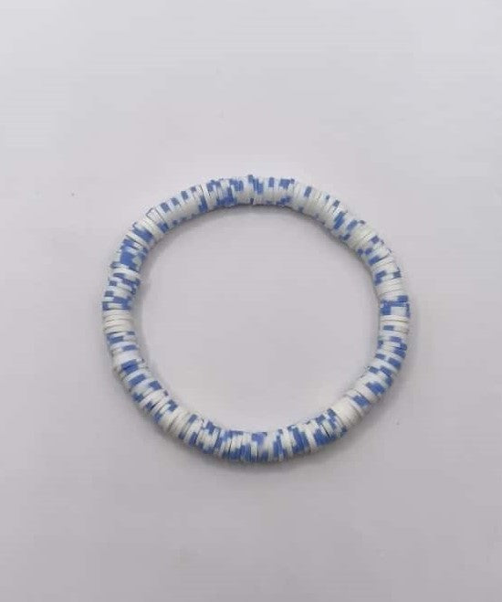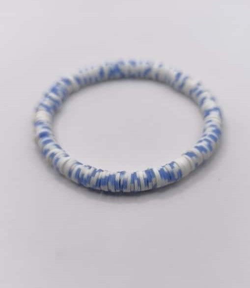 Bratara elastica realizata din discuri Heishi din argila polimerica, insirate pe ata elastica albastra.