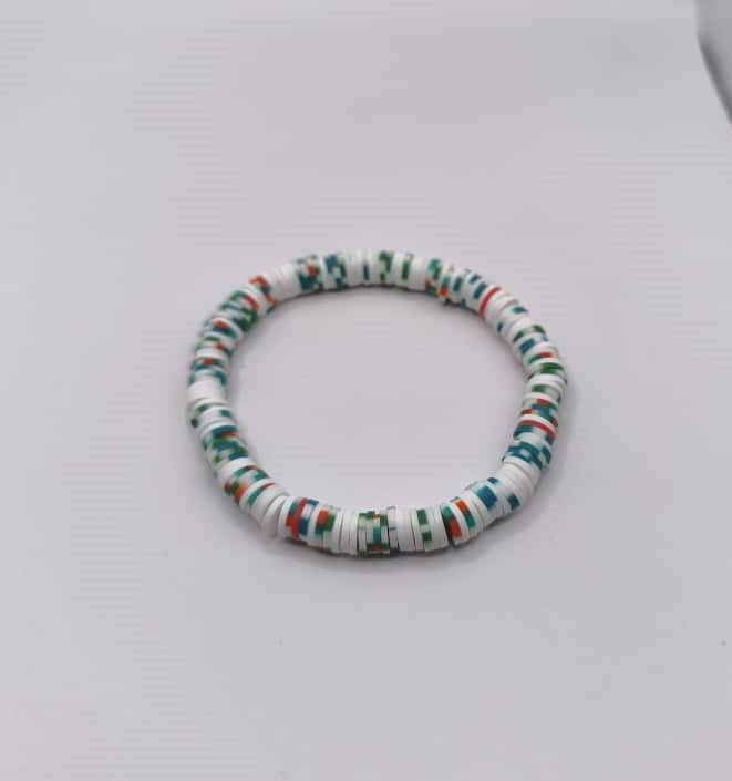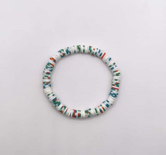 Bratara elastica realizata din discuri Heishi din argila polimerica, insirate pe ata elastica alba.