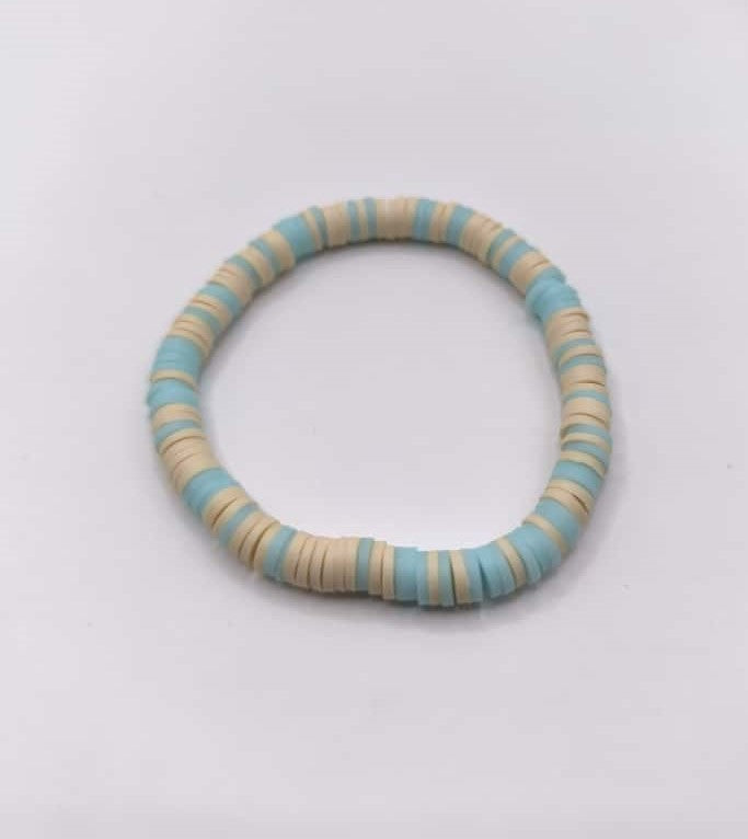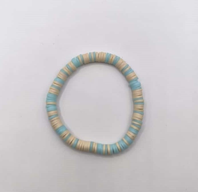 Bratara elastica realizata din discuri Heishi din argila polimerica, insirate pe ata elastica albastru deschis.