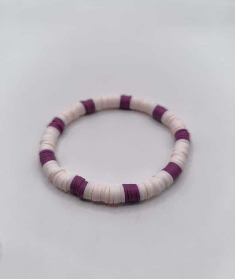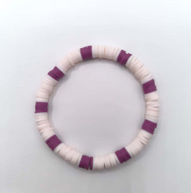 Bratara elastica realizata din discuri Heishi din argila polimerica, insirate pe ata elastica alba.