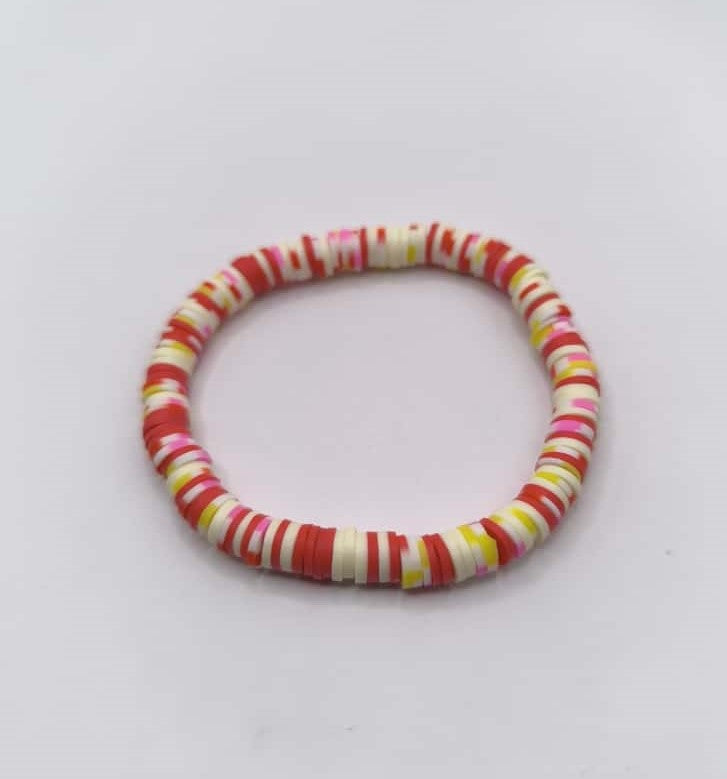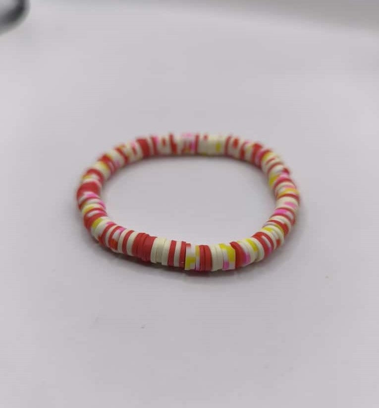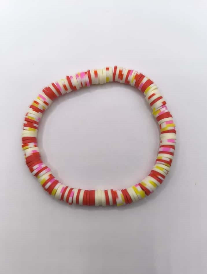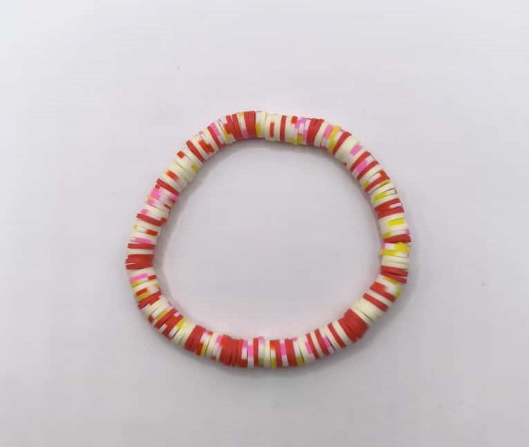 Bratara elastica realizata din discuri Heishi din argila polimerica, insirate pe ata elastica rosie.