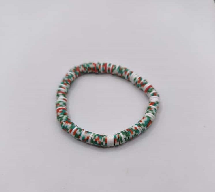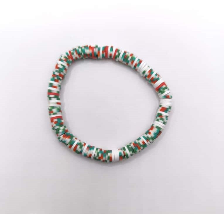 Bratara elastica realizata din discuri Heishi din argila polimerica, insirate pe ata elastica rosie.