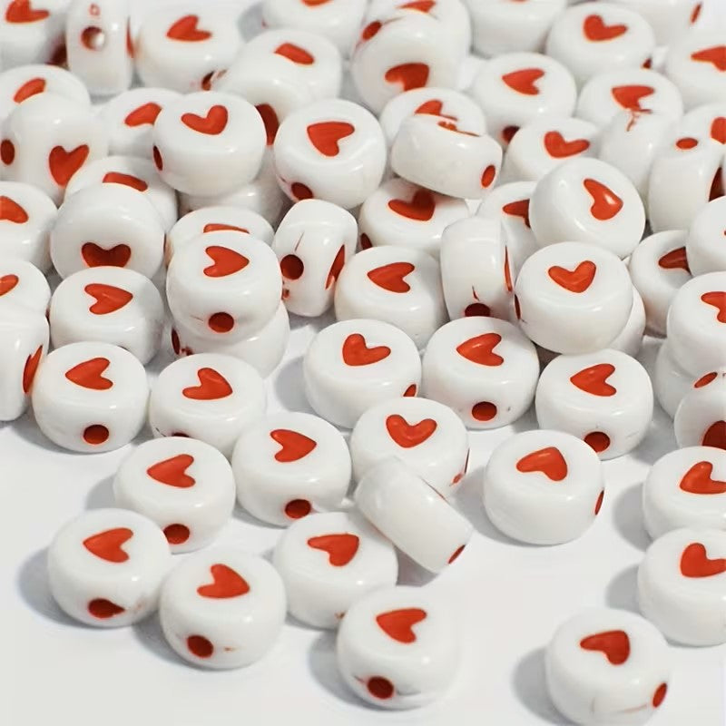 Margele acrilice rotunde plate 7mm alb cu model inima rosu
